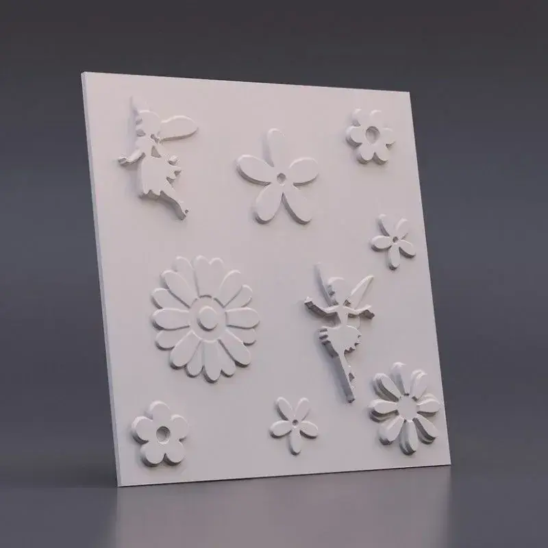 Гипсовые 3D панели "Феи" с детским сказочным рисунком прекрасно подойдут для внутренней отделки детской комнаты. Веселый рисунок в виде летающих фей среди цветов обязательно понравится малышам.